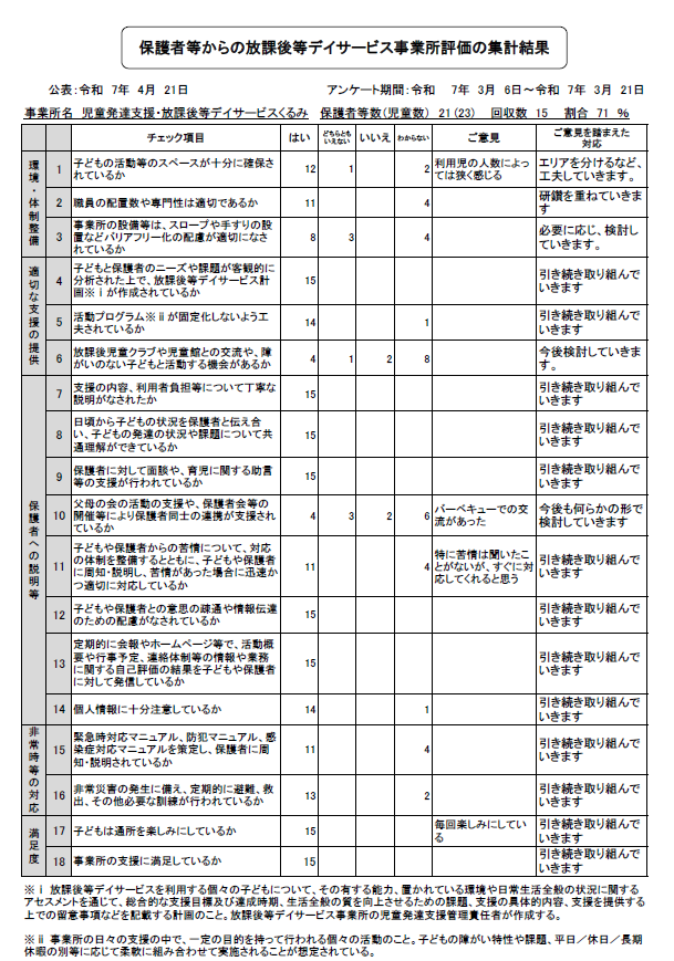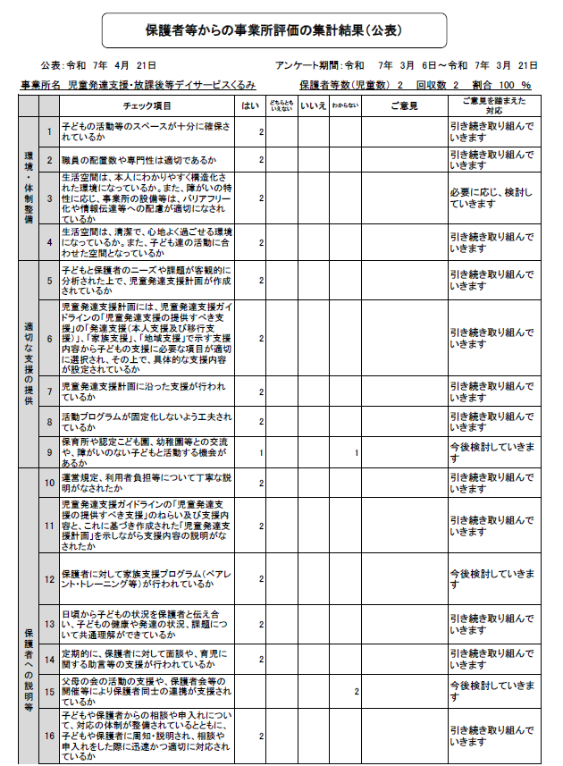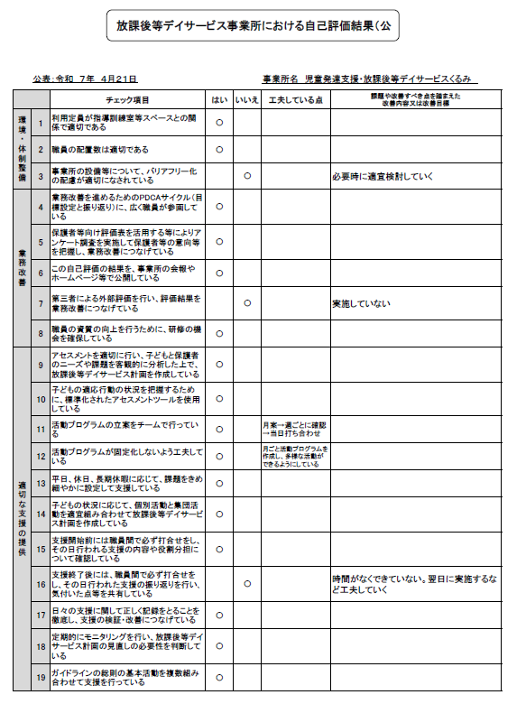 新着情報 / news 2025/04/21 自己評価公表(児童発達支援 保護者) 2025/04/21 自己評価公表(放課後等デイサービス 保護者) 2025/04/21 自己評価公表(放課後等デイサービス 事業所) Read More 弊社について / about Read More 業務内容 / works 子どもとしっかり向き合える児童向けデイサービスです。 スキルアップ可能な児童発達支援・放課後等デイサービスです! 子ども達の社会性を養うお手伝いをお願い致します。・学校までのお迎え・施設内での療育・家への送迎など 児童発達支援・放課後等デイサービスの強み 集団生活の中に入って初めて、これまで見えていなかった能力や個性が見えてくることも多いのではないでしょうか?そんな個性を引き延ばすための放課後等デイサービスはとてもやりがいのある仕事です。放課後等デイサービスのメリットは大きく分けて2つあると思います。1つは障害のある子どもを持つ親御さんが安心してお子様を預けて仕事ができること。もう1つは、放課後等デイサービスでの時間が障害のある子どもの発達にとって非常に有益になると思います。 Read More 募集要項 / recruit Read More よくある質問 / faq 仕事場の雰囲気はどんな感じですか? 和気あいあいとした環境、若いスタッフで明るい雰囲気です! どんな人が向いていますか? 子ども達は年齢も性格もさまざまで、嗜好は多種多様です。さらに必要としている支援もさまざま。一人ひとりに合わせて臨機応変な対応ができ、視野を広く全体に気配りのできる方も大歓迎です。 正社員の募集しかありませんか? たくさんのお問い合わせをいただき、ありがとうございます。検討を重ね、非常勤・短時間勤務や、遅い時間のシフトを作成しました。募集要項を更新していきますので、ぜひご覧ください。 Read More