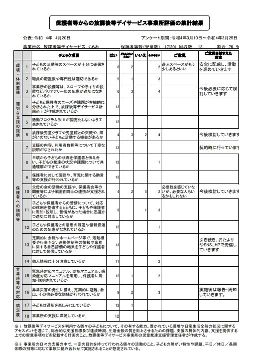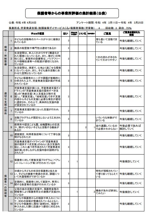 令和3年度の放課後等デイサービスの保護者からの評価結果です。